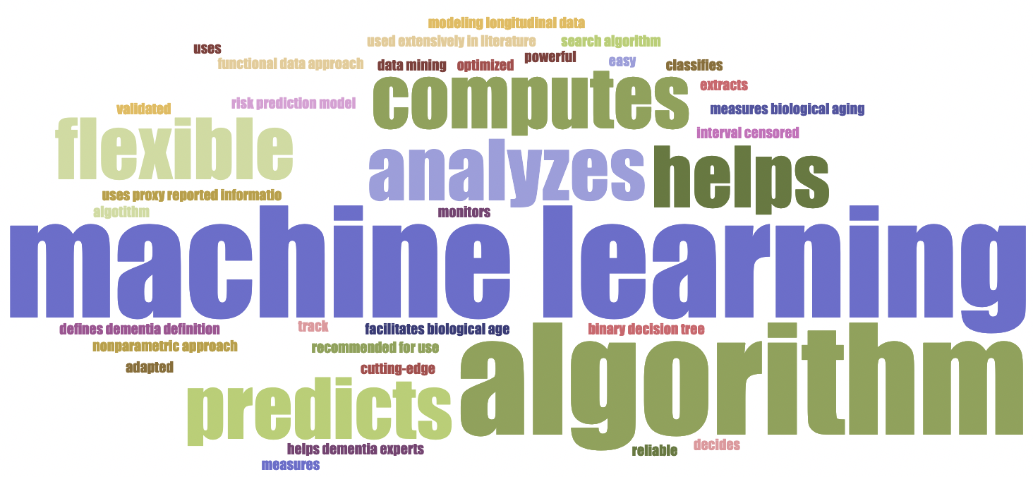 Algorithmische Technologien werden als tätige Problemlösungen verstanden, welche vermeintlich einfache, datengestützte Antworten auf komplexe gerontologische Fragen liefern (Abbildung 3). Worte, die dabei mit KI und algorithmischen Technologien in Verbindung gebracht werden, zeichnen erneut ein flexibles, dynamisches Bild eines intelligenten Systems, das Alter(n) misst, vorhersagt, und unterstützt.