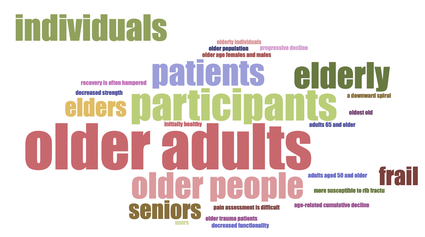 Ältere Menschen werden in der untersuchten Literatur hingegen mit deutlich weniger Worten beschrieben (Abbildung 4). Sie sind vielfach nur „Teilnehmer:innen” und „Patient:innen”, oder als gebrechlich, schwach und anfällig verstanden. Weniger sichtbar werden im gerontologischen Diskurs zu KI bislang positive Alter(n)sbilder, die die Heterogenität des Älterwerdens oder die aktive Rolle älterer Menschen in der Auseinandersetzung mit neuen Technologien betonen.